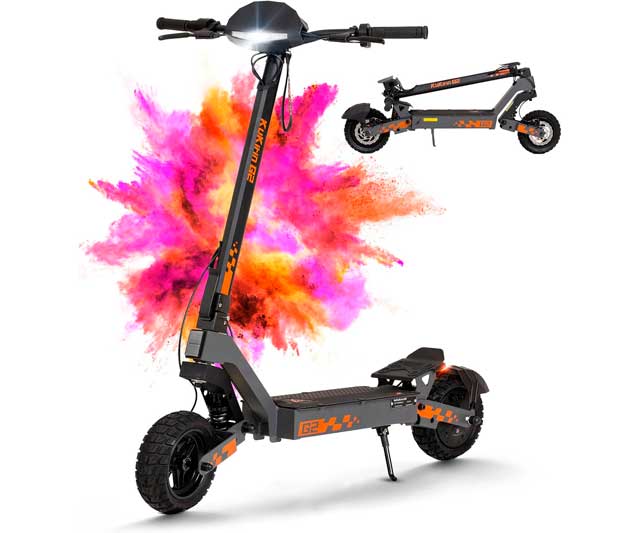 Este patinete destaca por su sistema de triple frenada y sus suspensiones delantera y trasera con doble amortiguador, que proporcionan una óptima absorción de baches y estabilidad en diversos terrenos. Las ruedas neumáticas Tubeless Dual Grip de 10 pulgadas aseguran una tracción superior, mientras que sus luces LED, que incluyen un foco frontal de alto brillo, intermitentes configurables y luz de freno trasera, garantizan una alta visibilidad y seguridad. Además, cuenta con el Certificado DGT y una amplia red de talleres en España, asegurando soporte y confianza en cada viaje.